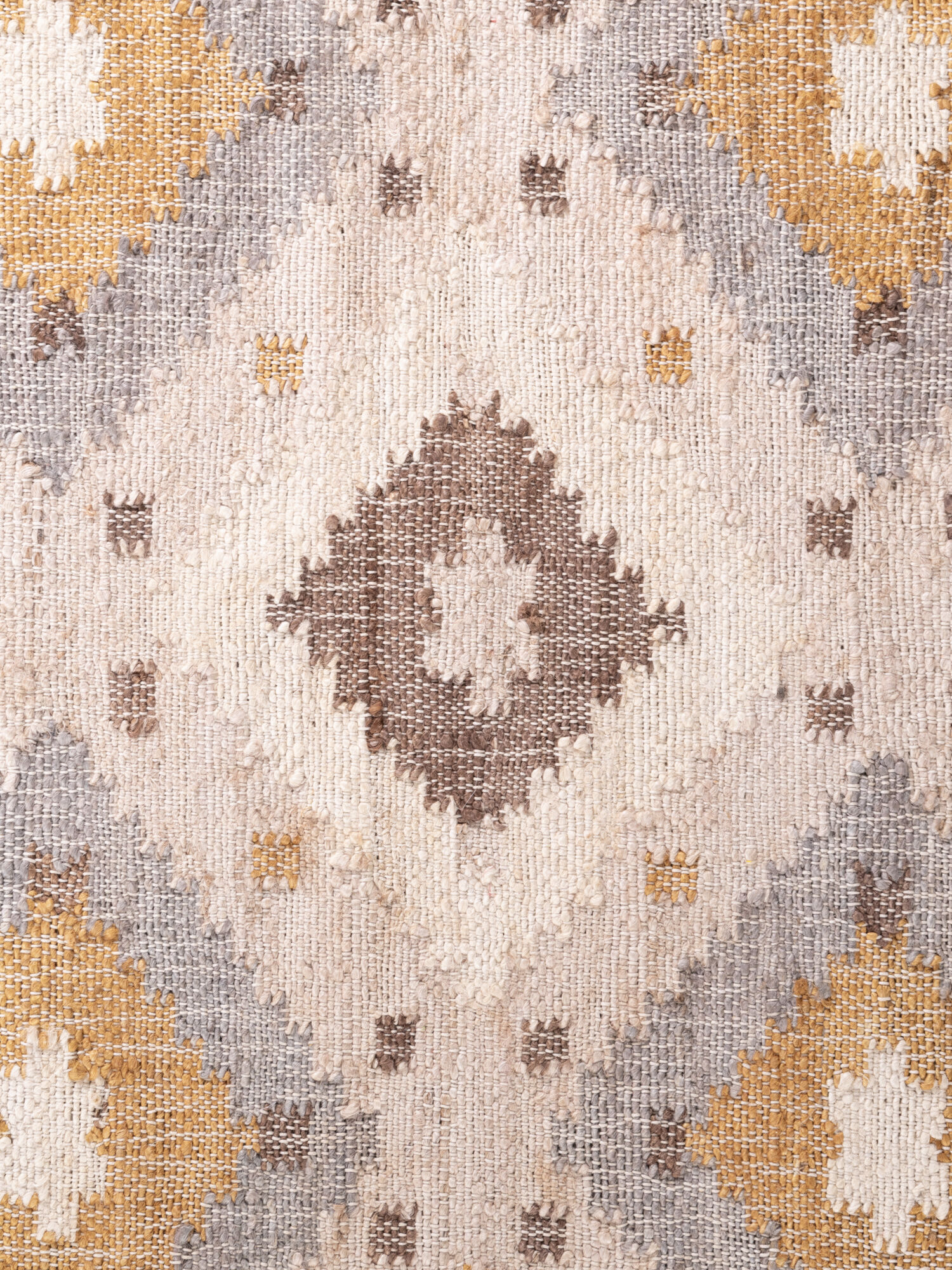 Mit einer Florhöhe von ca. 3 mm und stabilen Fransen überzeugt der Roya Kelim nicht nur optisch, sondern auch durch seine Strapazierfähigkeit. Dank seiner flachen Struktur eignet er sich ideal auch für Räume mit Fußbodenheizung.