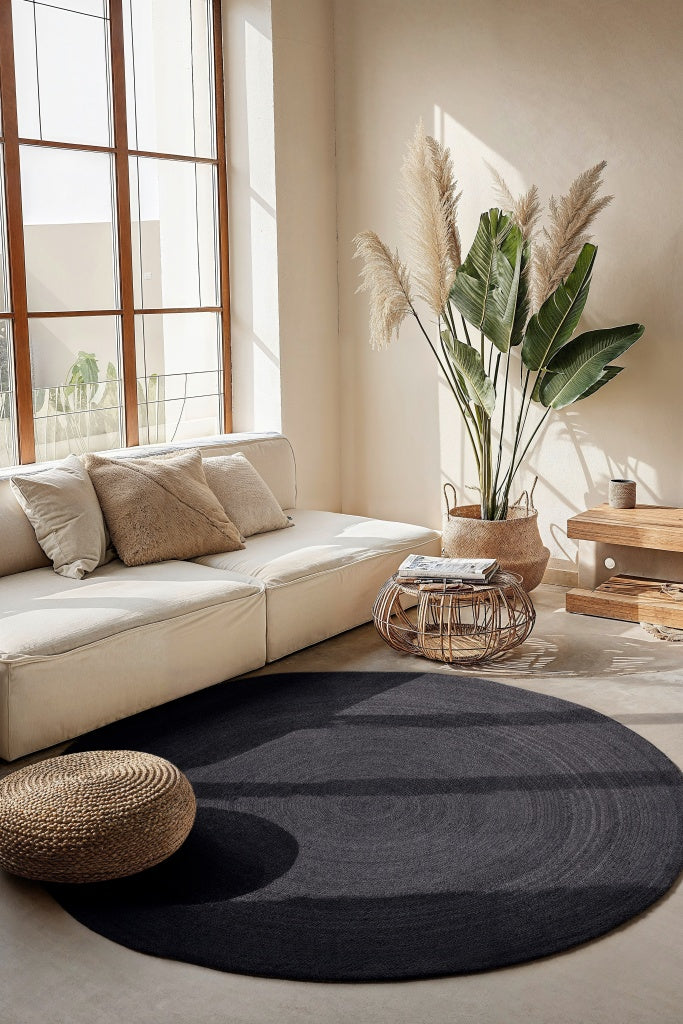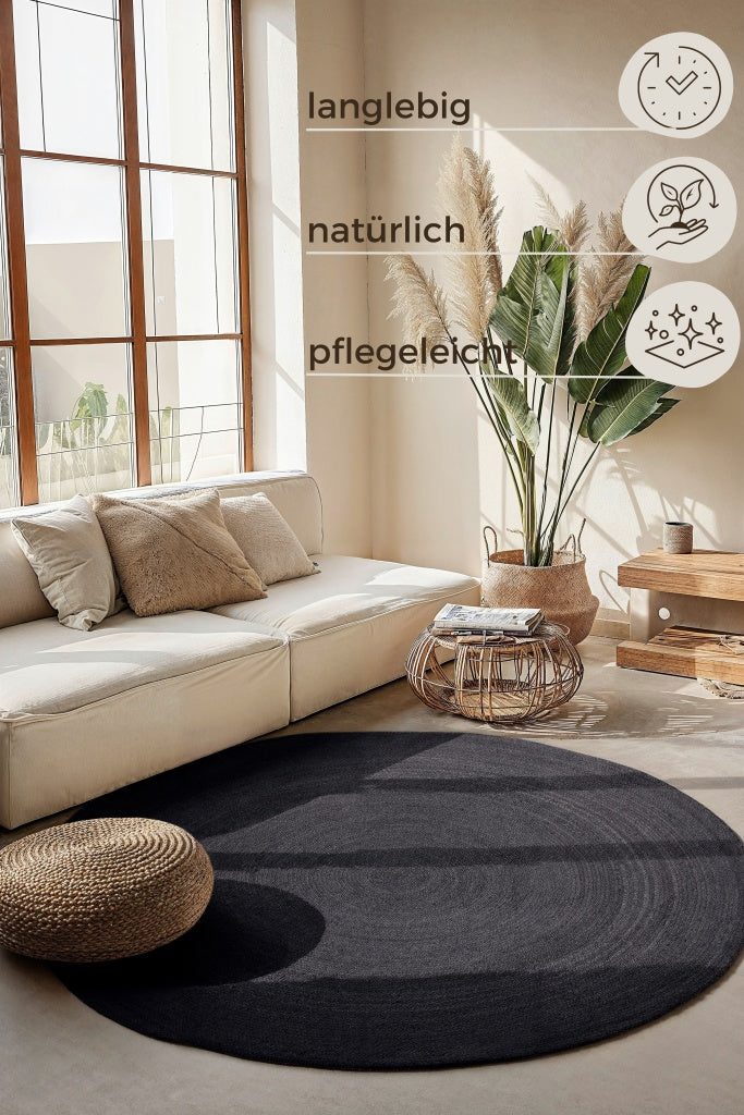 Jute ist eine Naturfaser mit rustikalem, natürlichen Charakter. Sie ist besonders strapazierfähig, umweltfreundlich und ideal für alle, die natürliche Materialien und erdige Töne schätzen. Da Jute Feuchtigkeit aufnimmt, sollte sie in trockenen Innenräumen verwendet werden. Zu Beginn können einzelne Fasern austreten, das ist typisch für dieses Naturmaterial und kein Qualitätsmangel.
