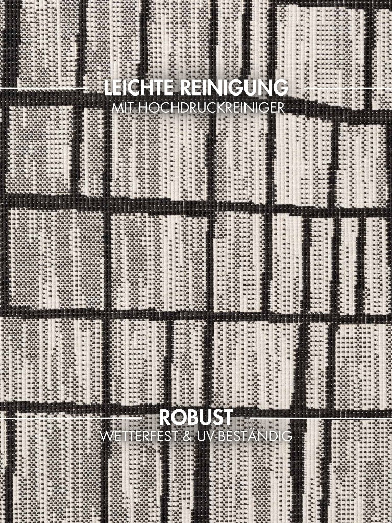 Die Teppiche der Ted Baker Haringey Kollektion verbinden modernes Design mit außergewöhnlicher Vielseitigkeit – perfekt für alle, die ihr Zuhause drinnen wie draußen stilvoll gestalten möchten. Ob im Wohnzimmer, auf der Terrasse oder dem Balkon: Diese modernen Teppiche schaffen überall eine einladende Atmosphäre und setzen durch ihre klassischen, aber dennoch ausdrucksstarken Farben besondere Akzente. Ihr kunstvoll modernes Muster verleiht jedem Raum eine elegante Note, während die beidseitige Nutzbarkeit Ihnen die Freiheit gibt, den Look jederzeit zu verändern, zwei Designs, ein Teppich, doppelt so viel Stil. Hochwertig in Europa gefertigt, sind die flach gewebten Teppiche robust, wetterfest und ideal für den täglichen Einsatz. Die strapazierfähigen synthetischen Fasern machen sie besonders pflegeleicht und langlebig – ganz gleich, ob Sonne, Regen oder der Familienalltag sie herausfordert. Mit der Haringey Kollektion holen Sie sich ein modernes Designhighlight in starken, zeitlosen Farben, das sich mühelos in jede Umgebung einfügt und drinnen wie draußen zum stilvollen Blickfang wird.