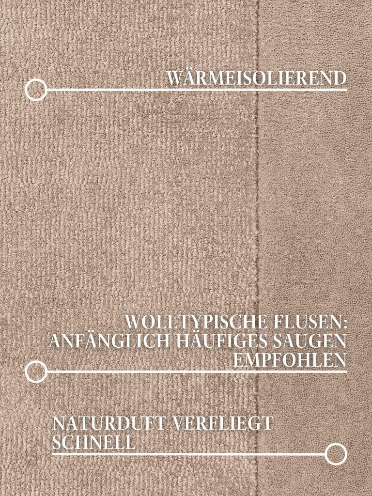 Wolle ist ein hochwertiges Naturmaterial mit hervorragenden Wärmeeigenschaften und natürlicher Schmutzabweisung. Sie sorgt für ein angenehmes Raumklima, da sie Feuchtigkeit aufnehmen und wieder abgeben kann. In den ersten Wochen können Wollteppiche lose Fasern verlieren, das gehört zum natürlichen Prozess und reduziert sich mit der Zeit. Außerdem kann Wolle anfangs einen leichten Eigengeruch haben, der jedoch schnell verfliegt. Insgesamt ist sie langlebig, gemütlich und pflegeleicht.