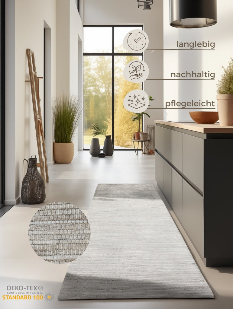 Diese ausgewogene Materialmischung vereint die natürliche Stärke von Jute, die Wärme und Weichheit von Wolle sowie die Hautfreundlichkeit und Pflegeleichtigkeit von Baumwolle. Das Ergebnis ist ein strapazierfähiger und zugleich angenehm weicher Teppich mit einer natürlichen, wohnlichen Ausstrahlung. Wie bei hochwertigen Naturfasern üblich, können anfangs einzelne Fasern austreten oder leicht fusseln - das ist völlig normal und legt sich mit der Zeit. Der Teppich sorgt für ein angenehmes Raumklima und bleibt bei richtiger Pflege lange schön und formstabil.